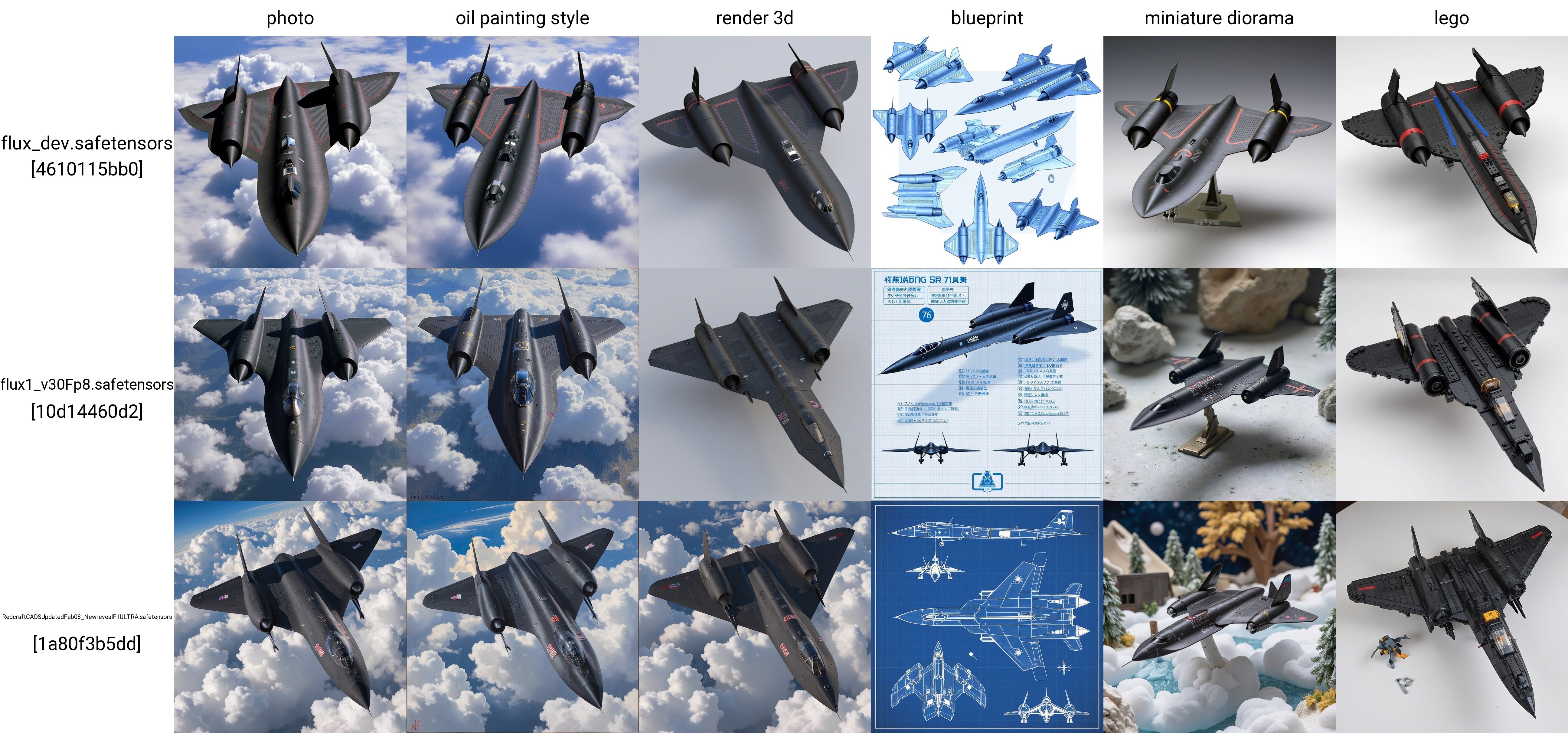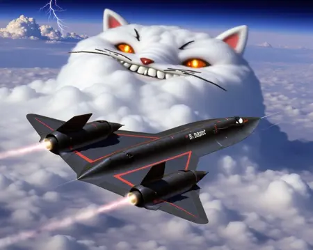 이 LoRA를 사용하여 초음속 정찰기 록히드 SR-71 블랙버드의 이미지를 생성할 수 있습니다.