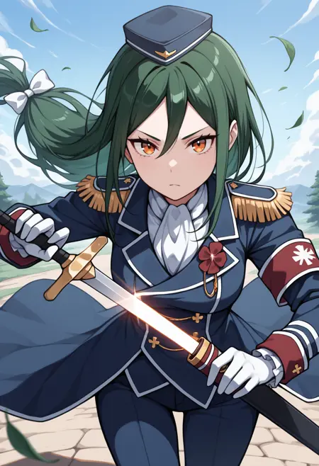 Default Outfit: blue headwear, military hat, military uniform, blue coat, tailcoat, epaulettes, long sleeves, red armband, white ascot, white gloves, blue pants