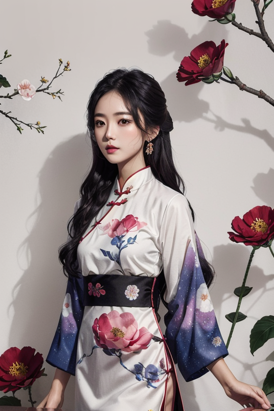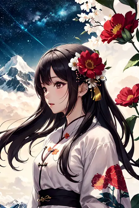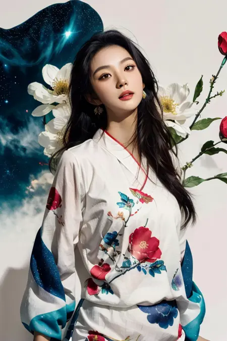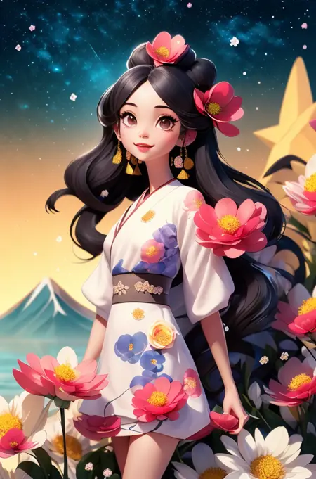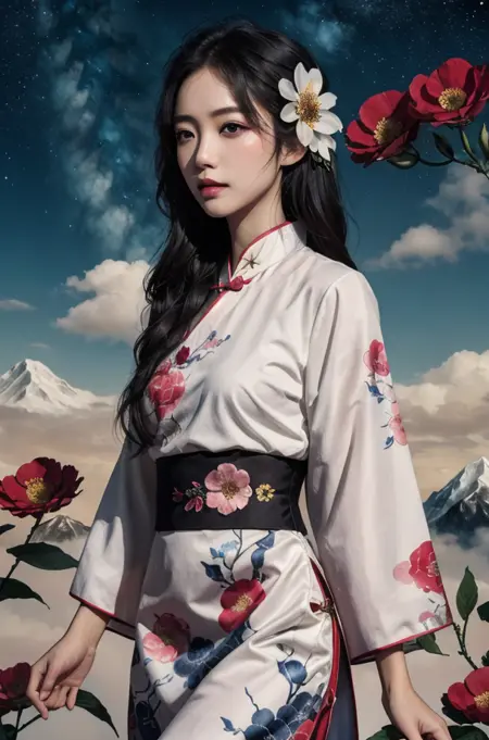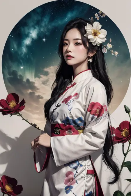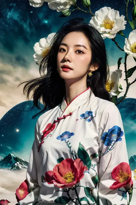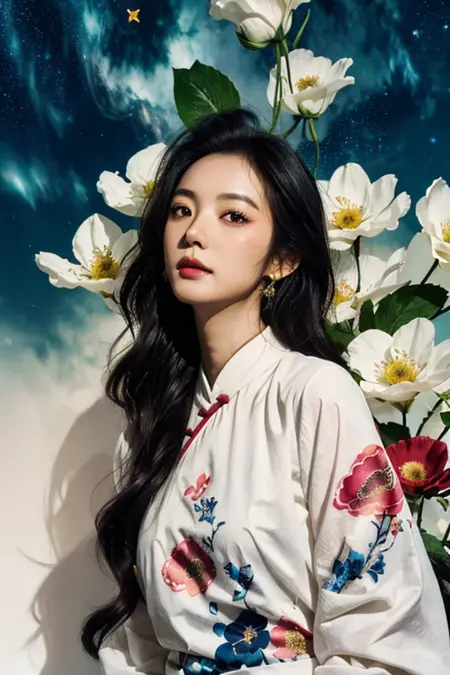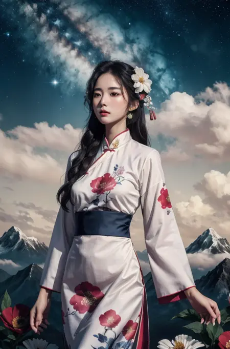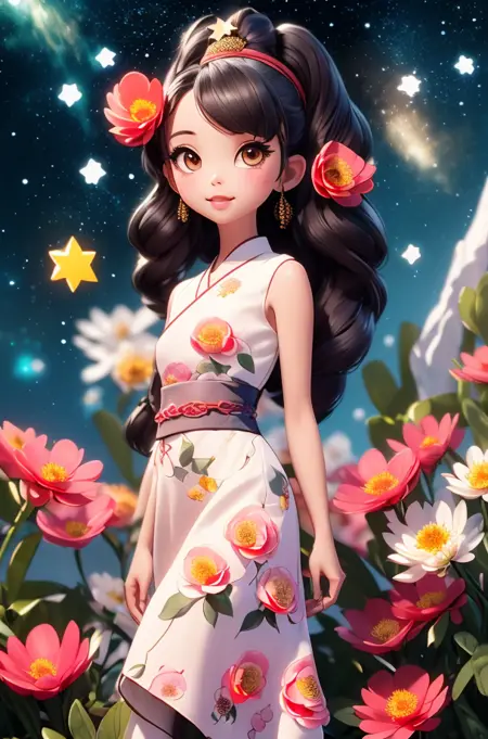 진실한 스타일, 풍부한 빛과 그림자 효과, 모델에 별하늘, 산, 꽃 배경 포함 (하나로 둘 효과)
