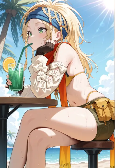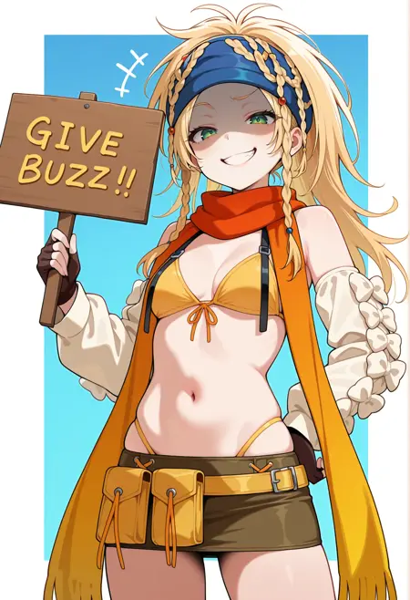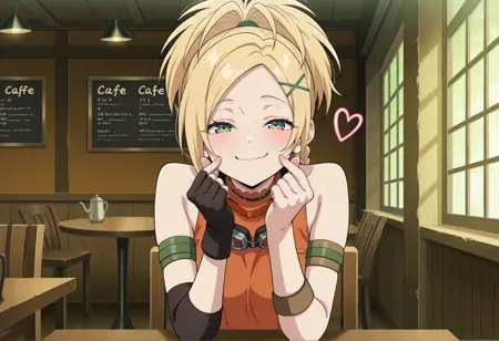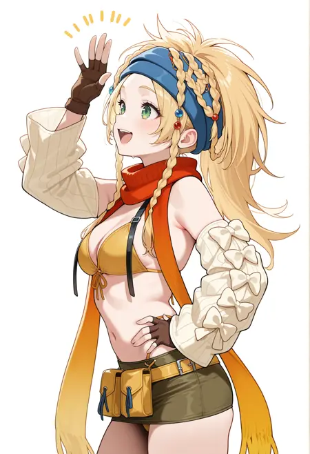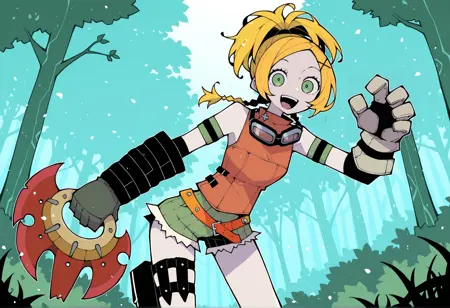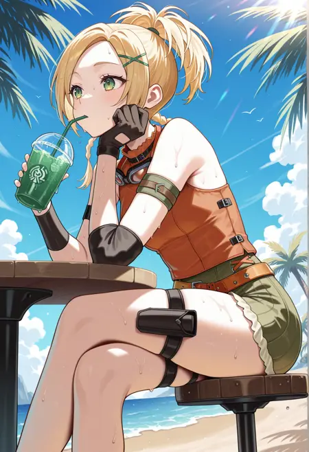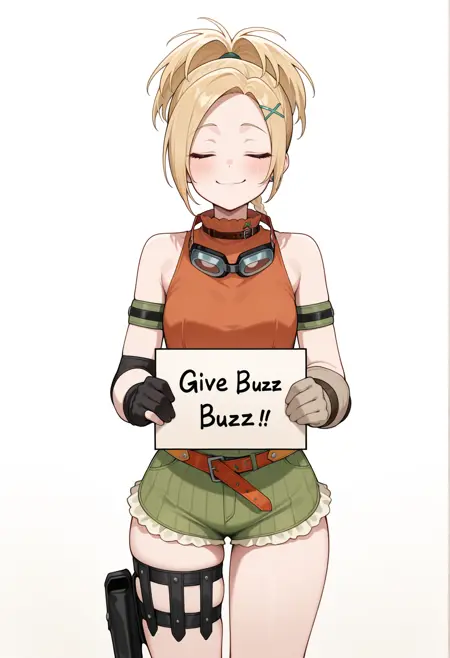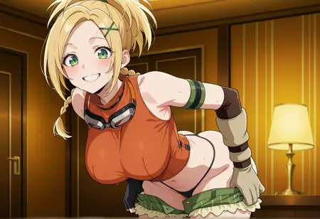 X: 金髪、緑色の目、ミディアムヘア、首にゴーグル、ポニーテール、低めのツインブレード、X型の髪飾り、チューブトップ、非対称な腕装具、アームレット、片側のエルボパッド、片側の指なし手袋、片側のエルボーグローブ、ショートパンツ、ベルト、太ももストラップ、太ももホルスター