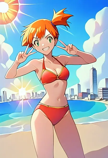 | Trained Words | PKMNMisty, 1girl, orange hair, green eyesCopied! bangs, side ponytail, short hair, eyelashesCopied! mistydefault, bangs, side ponytail, short hair, eyelashes, yellow shirt, sleeveless shirt, crop top, midriff, suspenders, demin shorts, short shorts, sneakers, red footwearCopied! Mistybikini, side ponytail, bangs, short hair, eyelashes, collarbone, bikini, red bikini, small breasts,Copied! MistyDisguise, short hair, orange hair, eyelashes, baseball cap, black headwear, long sleeves, jacket, track jacket, blue shorts,Copied! MistyMermaid, long hair, orange hair, eyelashes, monster girl, necklace, mermaid, shell bikini, star (symbol), hair ornament,Copied! |