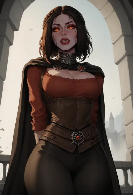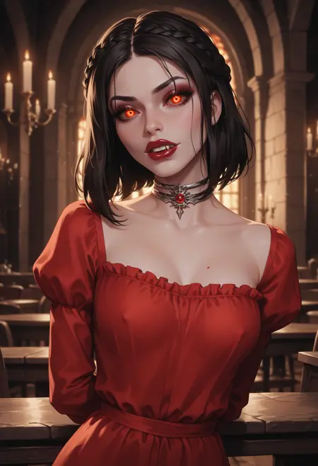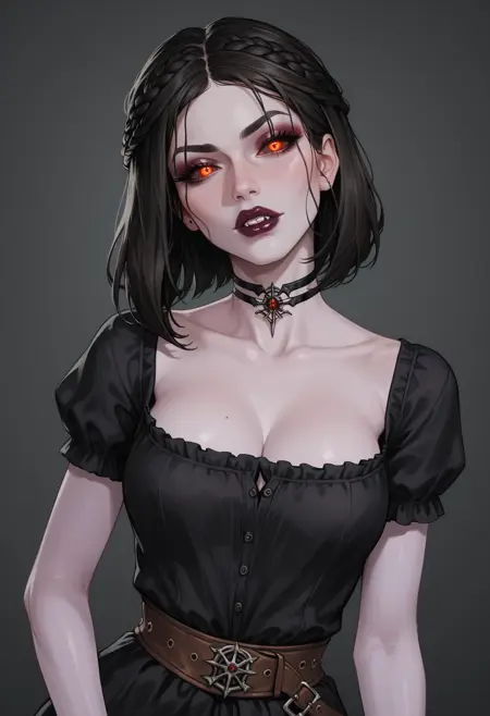 권장 태그: 1girl, solo, 주황색 눈, 빨간색 눈, 빛나는 눈, 색상 홍채, 검은 홍채, 뱀파이어, 중간 길이 머리, 검은 머리, 땋은 머리, 가슴, 송곳니, 뱀파이어 송곳니, 두꺼운 입술, 큰 입술, 립필러,