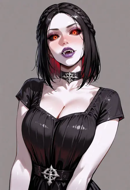 recommended tags: 1girl, solo, orange eyes, red eyes, glowing eyes, colored sclera, black sclera, vampire, medium hair, black hair, braid, breasts, fangs, vampire fangs, full lips, big lips, lip fillers,