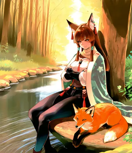 필수 태그: 긴 머리, 갈색 머리, 빨간 눈, 앞머리, 여우 귀, 머리 튜브, 귀걸이, 보석, 중간 크기의 가슴,
