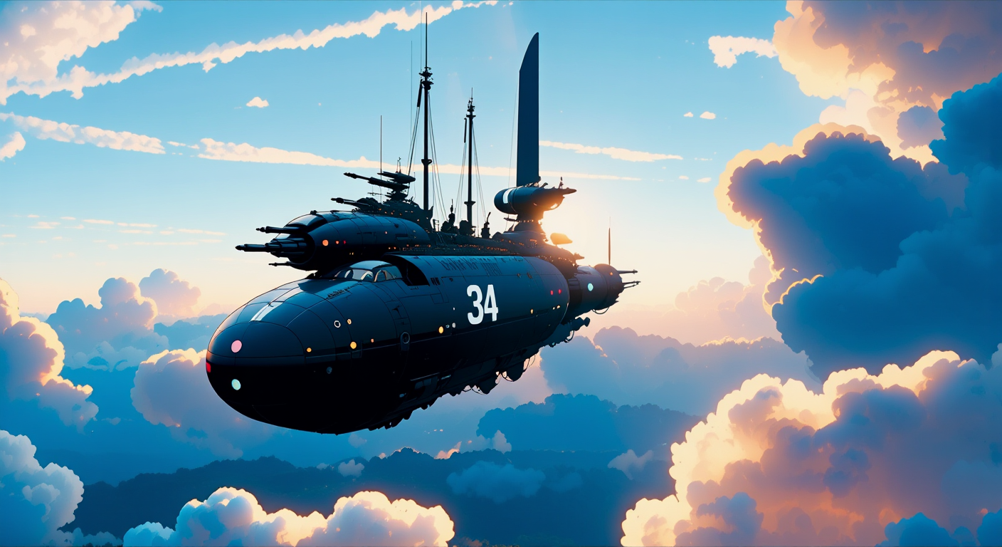 anime [TRIGGER CODE] [TYPE] airship, detailed [COLOR] plating, in the background, [SKY TYPE] ([NUMBER])