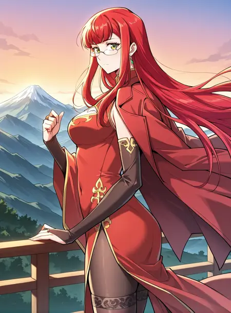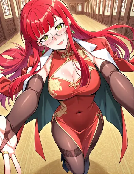chinese clothes, red dress, glasses, earrings, pantyhose, blackbridal gauntlets, elbow gloves, covered navel, wide sleeves, thighhighs, high heel boots, jacket on shoulders, clothing cutout