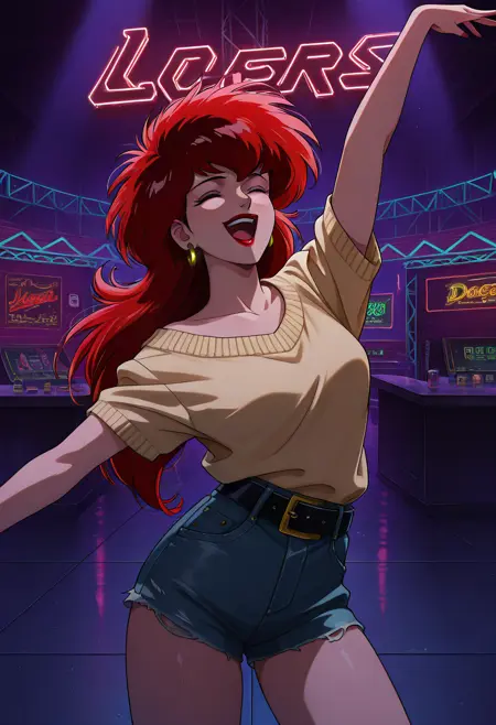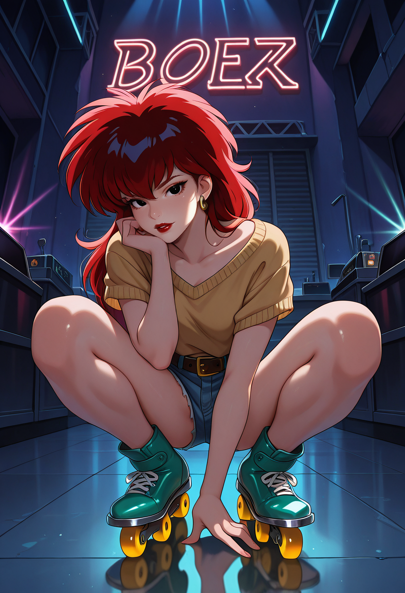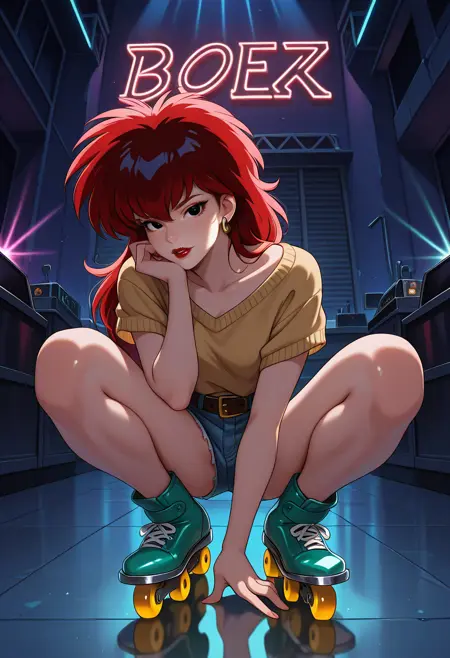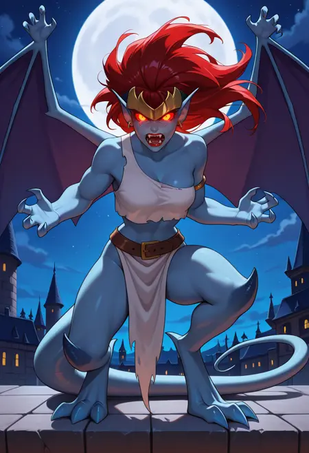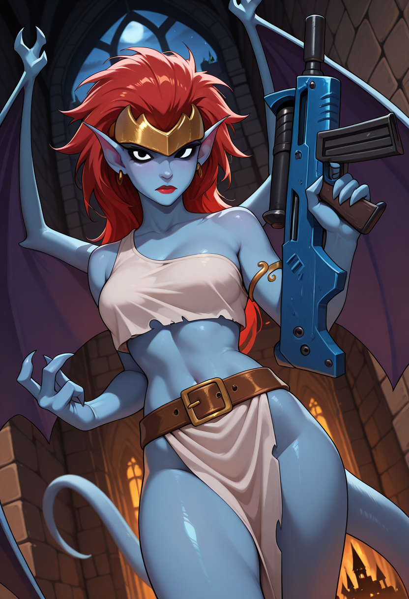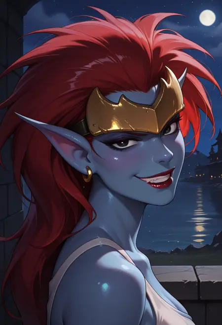 monster girl, colored skin, blue skin, red hair, long hair, pointy ears, lipstick, claws, wings, tail,