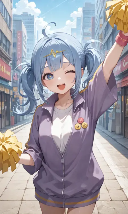 telepathy m1ku, twintails, ahoge, purple jacket, track jacket, white shirt, wristband- ポンポンを追加したい場合は、