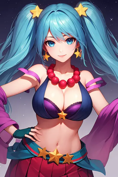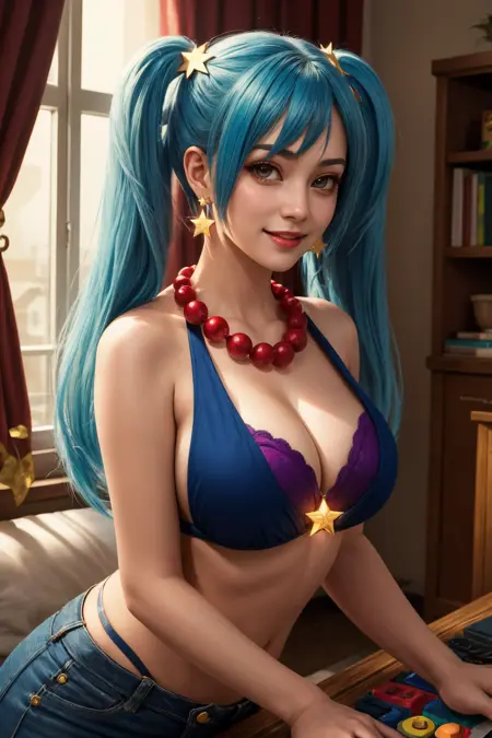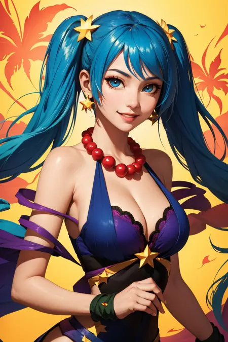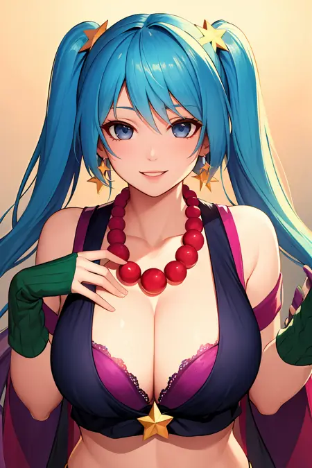 태그: 아케이드 손아, 1소녀, 더블테일, 목걸이, 귀걸이, 별 모양 머리 장식, 손가락 없는 장갑, 가슴 노출, 파란색 머리