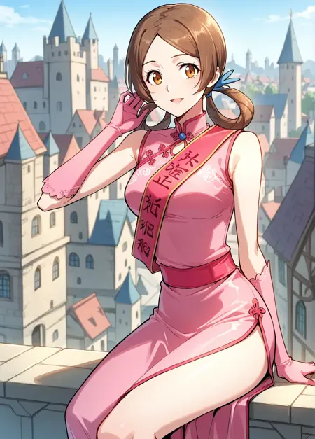 chinese clothes, pink dress, pink gloves, elbow gloves, jewelry, sash, sleeveless, bare shoulders