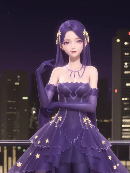 - SYNNxinzhihai, 1girl, purple dress, solo, long hair, purple eyes, purple gloves, purple hair, necklace, bare shoulders, looking at viewer, jewelry, elbow gloves, smile, star hair ornament, see-through, makeup, closed mouth, frills, parted bangs, cityscape, night, mature female, hand on hip, cowboy shot, close-up,