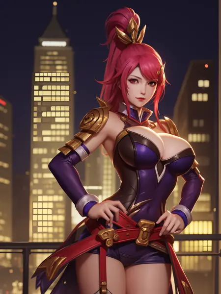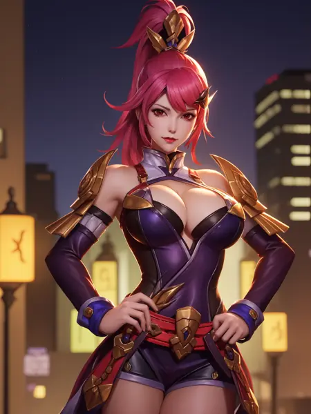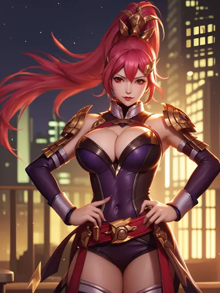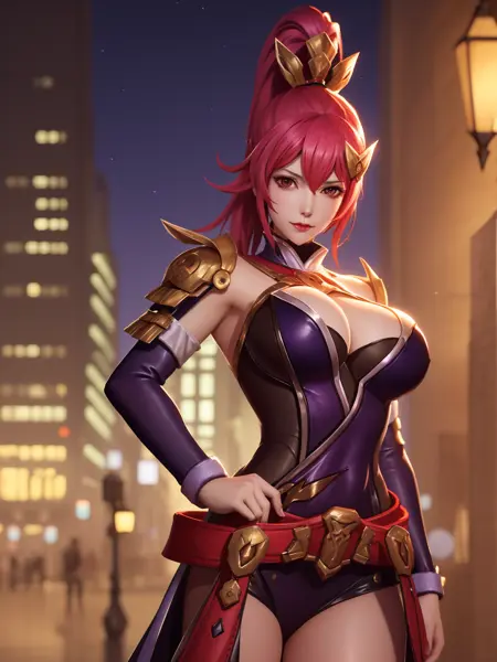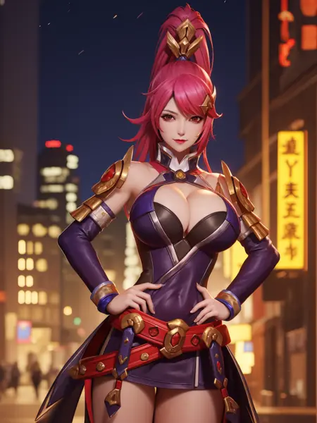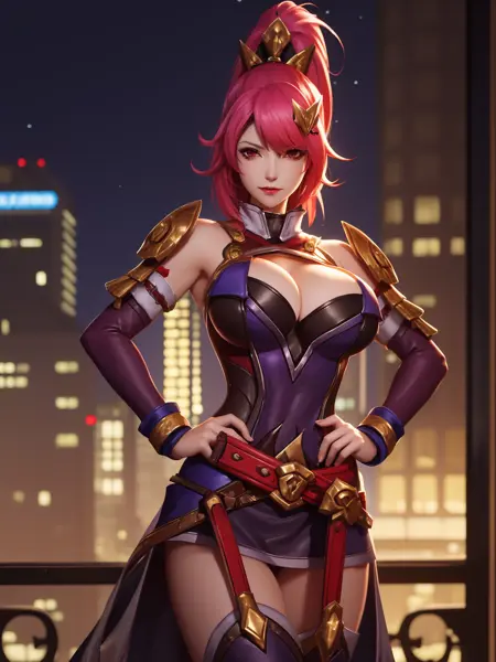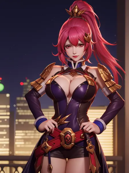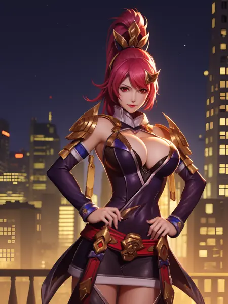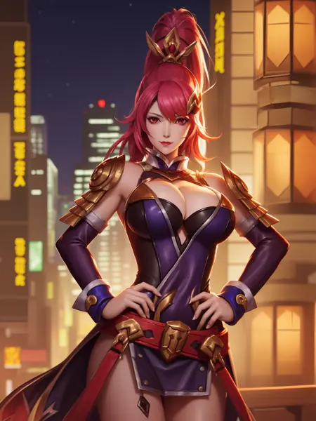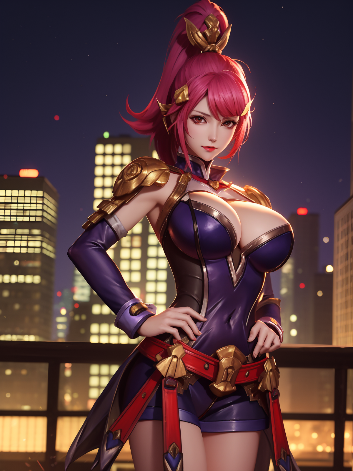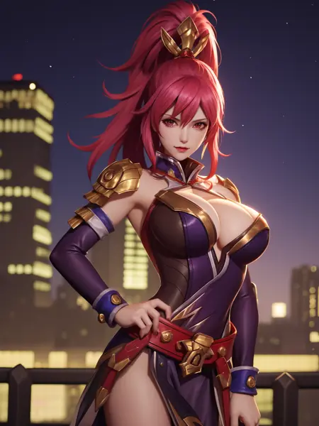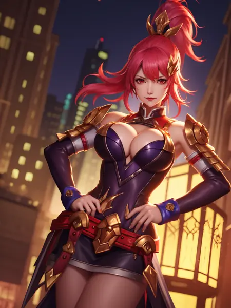 • WZRYhuamulanYP, 1girl, solo, breasts, ponytail, red hair, long hair, red eyes, large breasts, cleavage, armor, detached sleeves, belt,hair ornament,dress,cityscape, night,looking at viewer, mature female,hand on hip,
