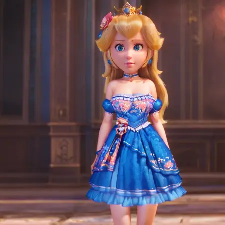 蓝色连衣裙触发词:PeachBlueDress, 1girl, 金发, 蓝色连衣裙, 碧琪公主, 肘套, 饰品, 蓝眼睛, 长发, 王冠, 耳环, 项圈, 露肩, 白色手套, 无肩带连衣裙