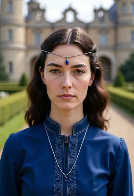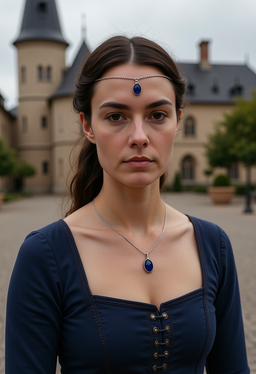 “一位女性佩戴着kesiera,一条精致的银链,中央悬挂一颗小蓝宝石置于额前”