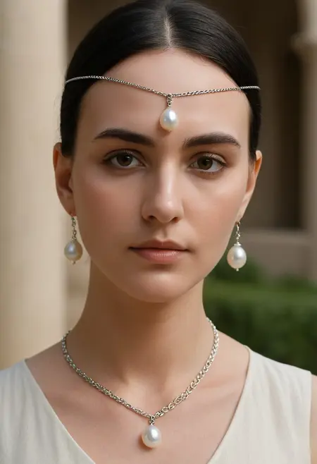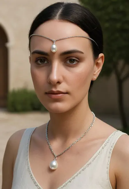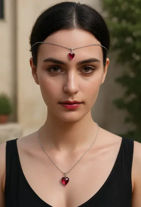 “a woman wearing a kesiera, a delicate silver chain with a small sapphire resting on her forehead”
