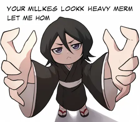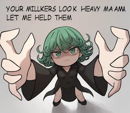 기본 프롬프트: pov, 위에서 내려다보기, 시청자에게 손을 뻗는, 손이 시청자 쪽으로, 큰 손, 치비, 무표정, 중립적인 표정, 요청하는, 텍스트, 영어 텍스트, 텍스트: "your milkers look heavy fern let me hold them",