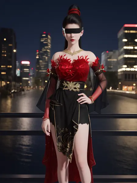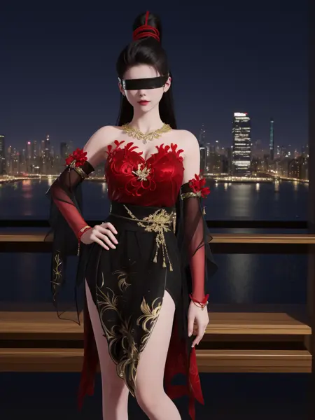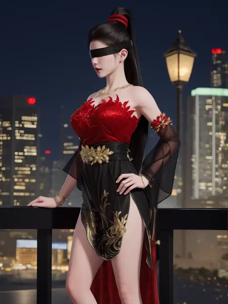 - YJWJninghongyeYSHH, 1girl, blindfold, black hair, ponytail, long hair, solo,dress, bare legs, jewelry, necklace,standing, cityscape, night, hand on hip, mature female, red,