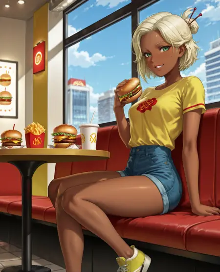 Appearance: Arsl4n, 1girl, dark-skinned female, short hair, blonde hair, green eyes