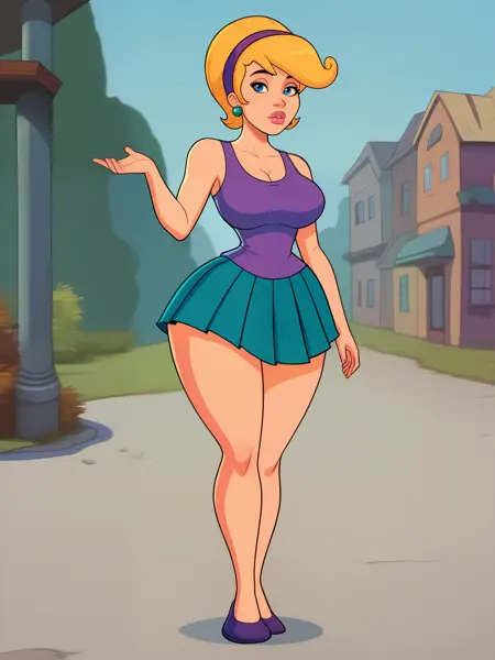 googie, hairband, short hair, jewelry, earrings, blonde hair, skirt, pleated skirt, purple hairband, tank top, purple shirt, teal skirt, blue eyes,