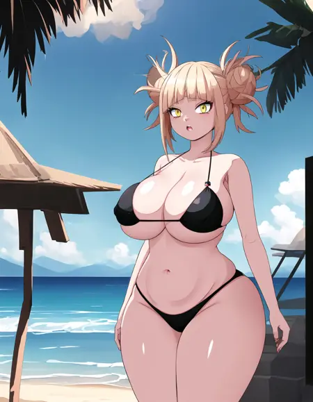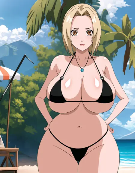 サポートプロンプト:太ももが太い、広いヒップ、大きな胸、ビキニのビーチ