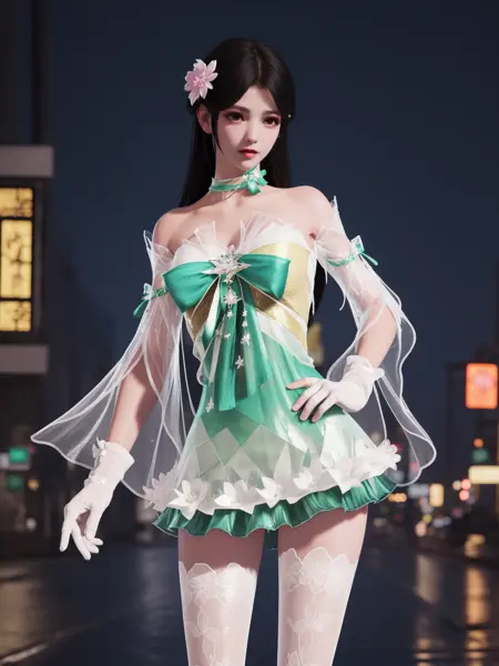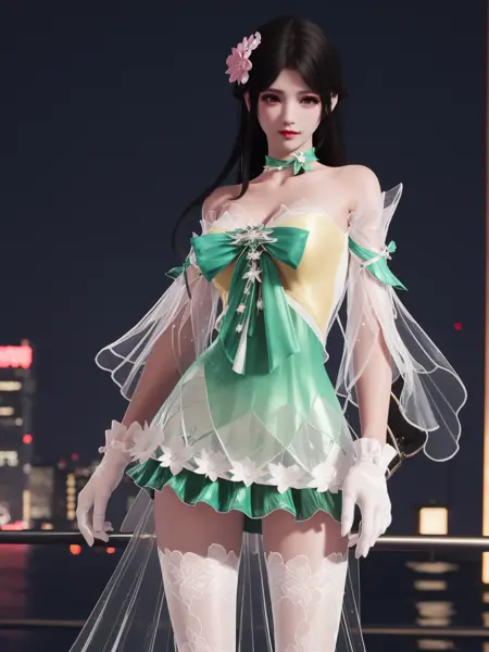- YJWJyingzipingCX, 1girl, dress, solo, white thighhighs, hair flower, gloves, long hair, choker, black hair, bare shoulders, detached sleeves, see-through, cityscape, night, looking at viewer, mature female, hand on hip,