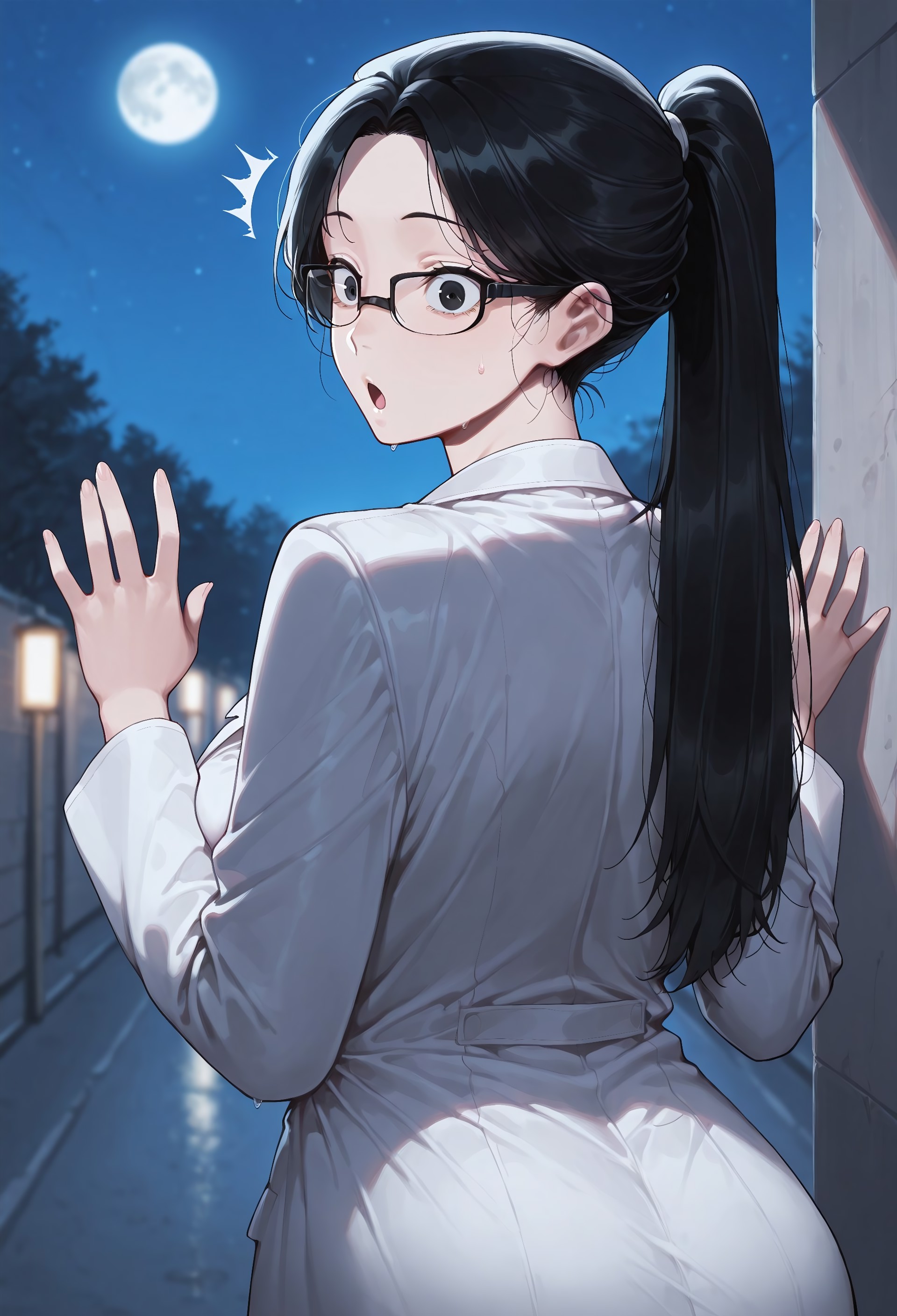 c0ath1roo, 1girl, black eyes, black hair, breasts, large breasts, ponytail, black-framed eyewear, semi-rimless eyewear, white coat, labcoat, name tag, shirt, collarbone, id card, pants, pocket, grey pants, long sleeves,