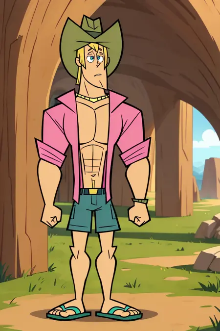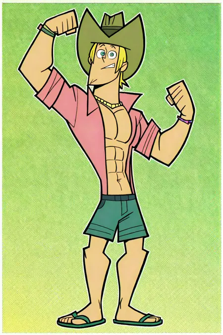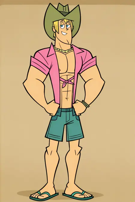 GeoffTDI, 1boy, bulky, short blonde hair, dodger blue eyes, abs, olive green cowboy hat, pink shirt, light yellow beaded necklace, olive green wristband, dark teal blue shorts, dark teal blue flip flops, geoff (tdi)