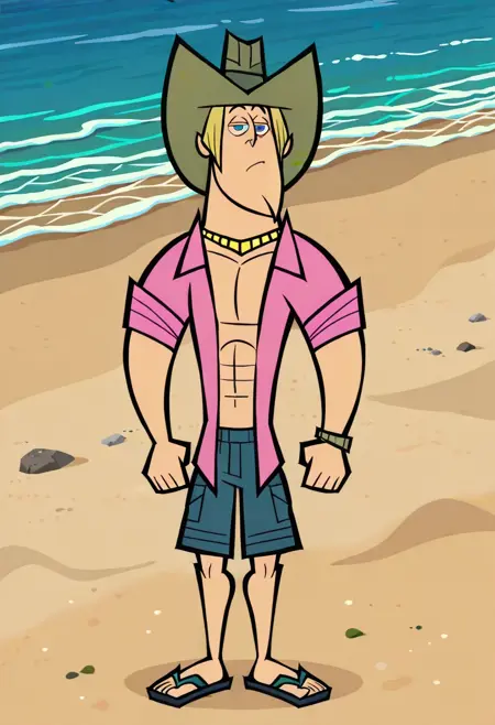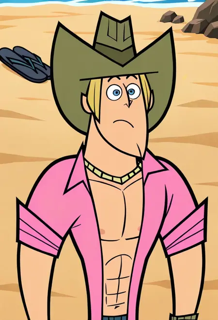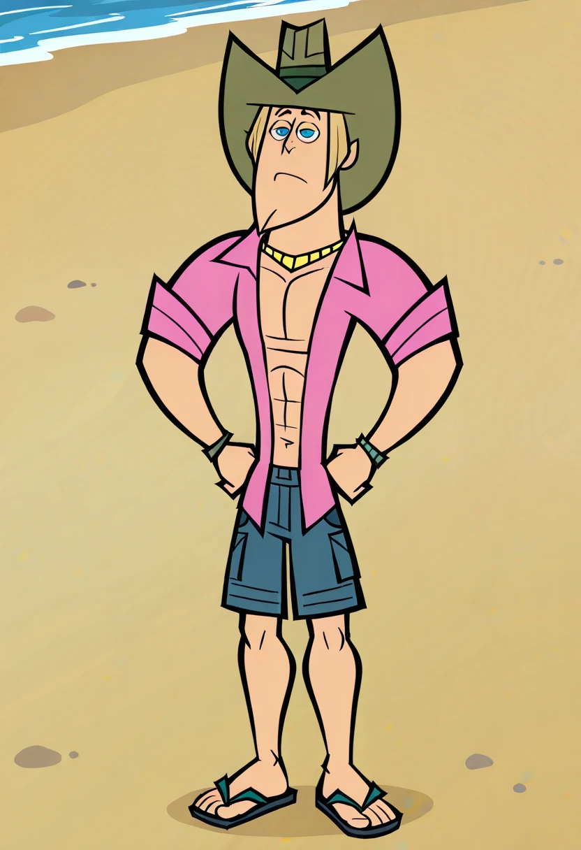 GeoffTDI, 1boy, bulky, short blonde hair, dodger blue eyes, abs, olive green cowboy hat, pink shirt, light yellow beaded necklace, olive green wristband, dark teal blue shorts, dark teal blue flip flops