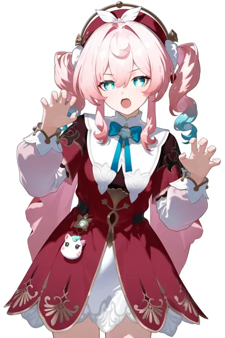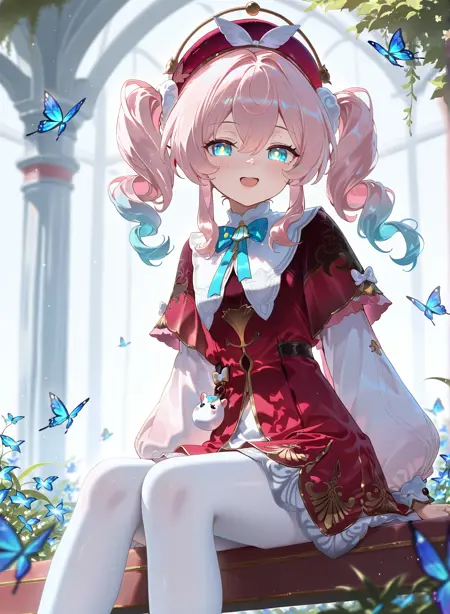 hyacine \(崩坏:星穹铁道\),1girl, 粉色头发, 水蓝色眼睛, 连衣裙, 长袖, 帽子, 双马尾, 蝴蝶结,