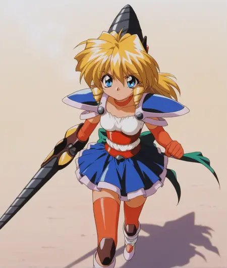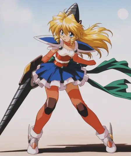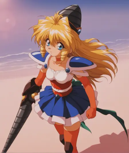 D4dorisu,blonde hair, outdoor,1hand drill arm,multi colored dress,long hair,blue skirt,drill hat,retro artstyle,weapon,ruridou_dorisu,d4_princess