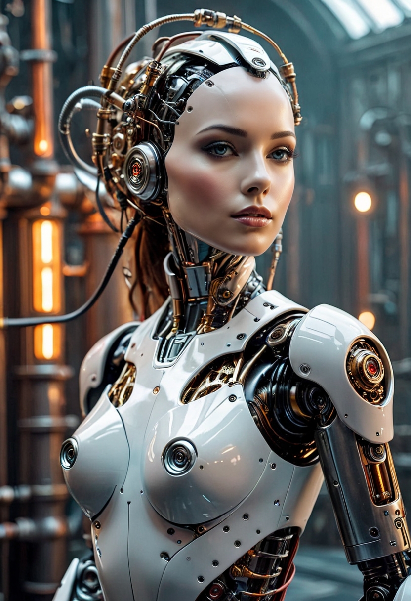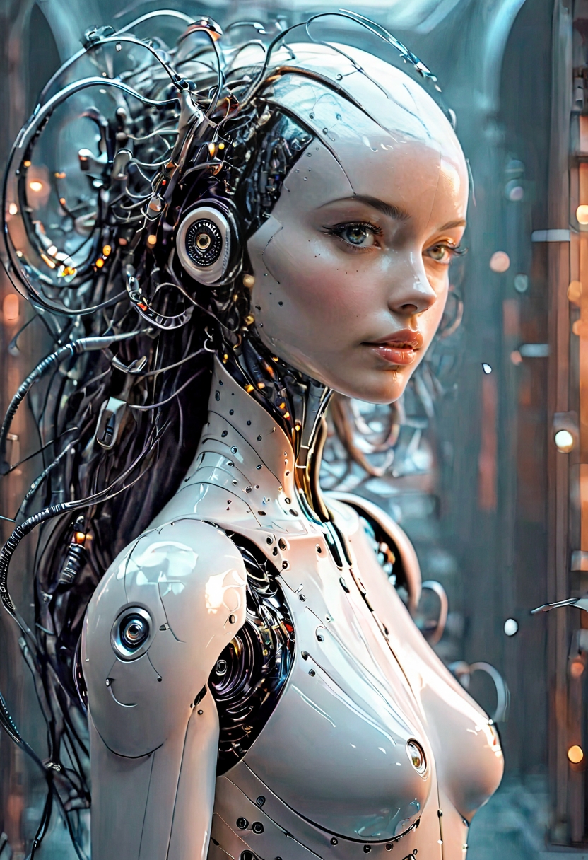 android female, slender body, flexible body, robot joints, joints, science fiction, medium chest, thin waist, grace, wire-hair, smooth surfaces, solo, 1girl, android, cyberpunk, breasts, cyborg, lips, robot, medium breasts, cable, standing, ass