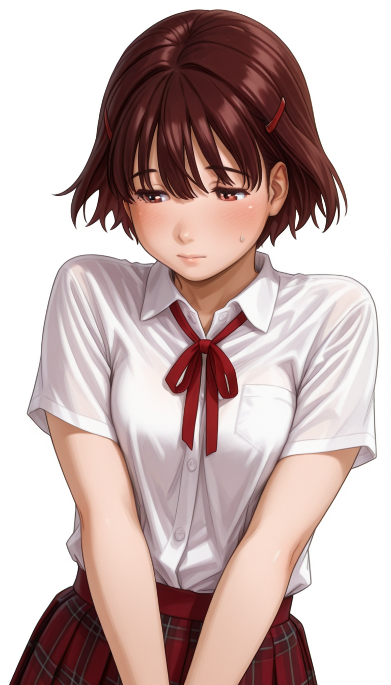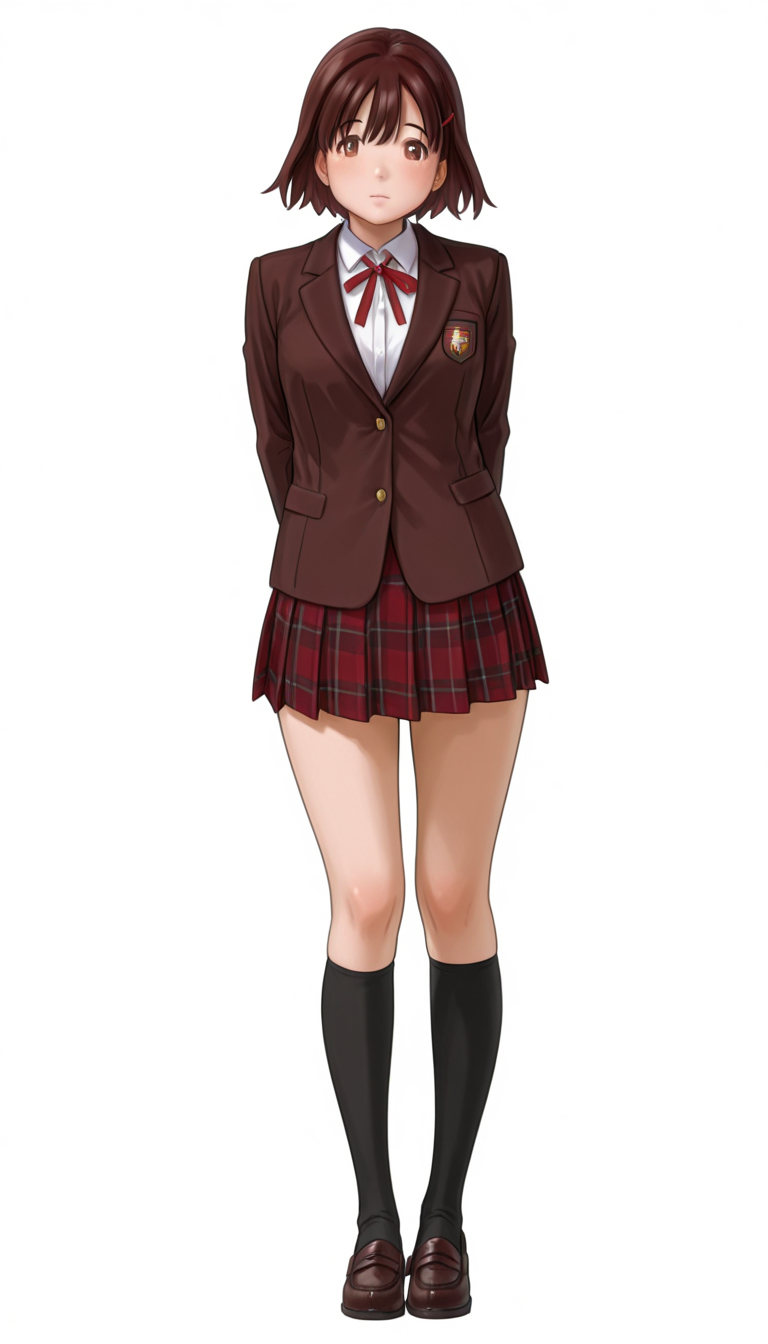 유니폼: Uniform, pleated skirt, red ribbon tie, checkered skirt, red skirt, white shirt, loafers, brown blazer with school emblem, black socks