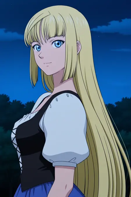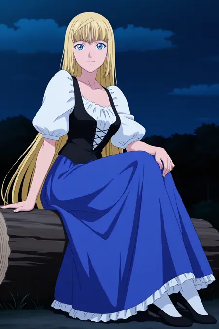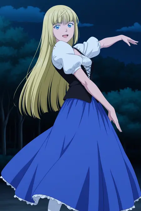 jeanne d'arc, long hair, blonde hair, sidelocks, ahoge, choppy bangs, blue eyes, dirndl, short sleeves, puffy sleeves, white shirt, black vest, blue skirt, long skirt, lace-trimmed skirt, white pantyhose, black footwear