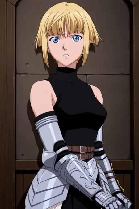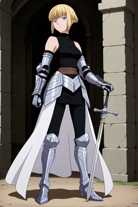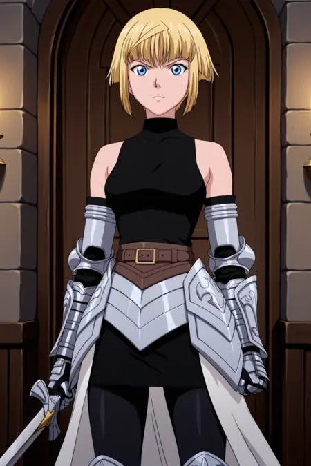 jeanne d'arc, short hair, blonde hair, undercut, sidelocks, ahoge, choppy bangs, blue eyes, armored dress, sleeveless, sleeveless turtleneck, black turtleneck, detached sleeves, rerebrace, gauntlet, arm guards, multiple belts, faulds, pencil skirt, armored skirt, black pantyhose, armored boots, knee boots
