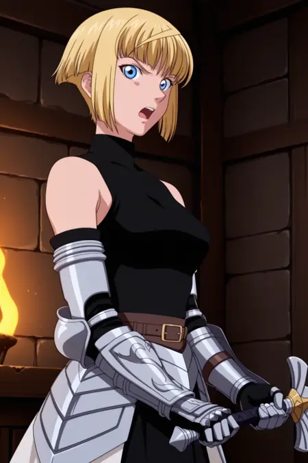 jeanne d'arc, short hair, blonde hair, undercut, sidelocks, ahoge, choppy bangs, blue eyes, armored dress, black shirt, tight shirt, cuirass, rerebrace, yellow bracelet, black gloves, fingerless gloves, belt, white skirt, pencil skirt, armored skirt, black pantyhose, armored boots, ankle boots