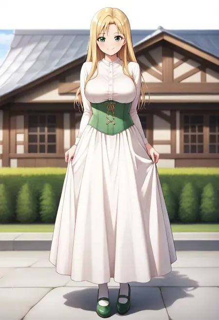 의상에 대해, (원하시는 경우), 흰 드레스, 녹색 코르셋, 녹색 신발,