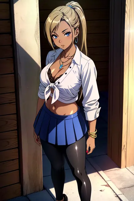 Manatsu Shiraishi, 1girl, breasts, solo, navel, cleavage, jewelry, school uniform, skirt, long hair, brown hair, blue eyes, nail polish, pleated skirt, gyaru, necklace, serafuku, looking at viewer, midriff, dark-skinned female, shirt, underwear, bra, dark skin, bracelet, large breasts, blue skirt, white shirt, outdoors, collarbone, high ponytail, tan