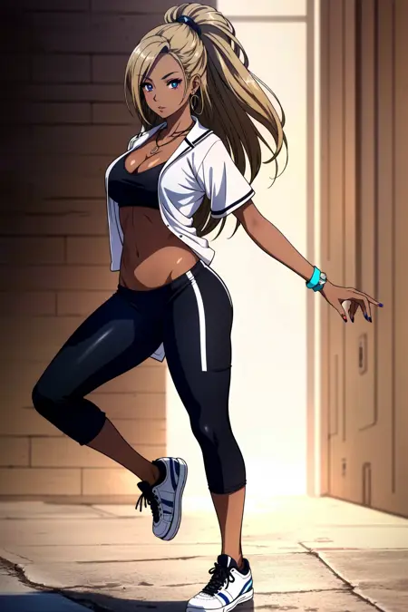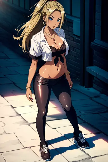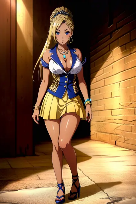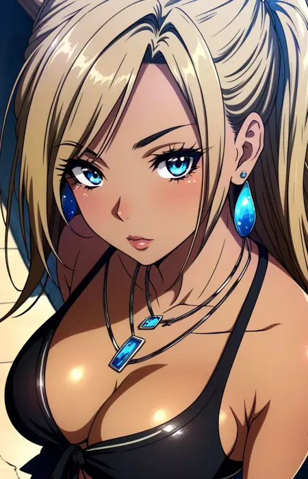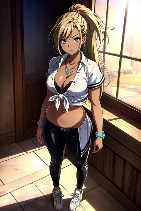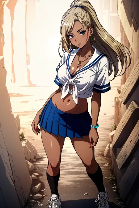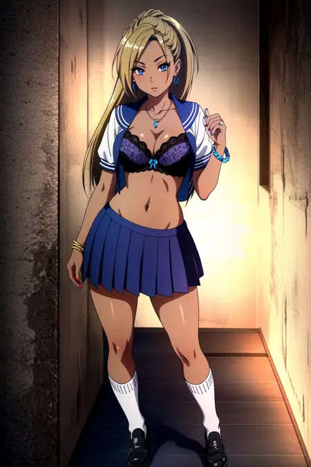 Manatsu Shiraishi, 1girl, breasts, solo, navel, cleavage, jewelry, school uniform, skirt, long hair, brown hair, blue eyes, nail polish, pleated skirt, gyaru, necklace, serafuku, looking at viewer, midriff, dark-skinned female, shirt, underwear, bra, dark skin, bracelet, large breasts, blue skirt, white shirt, outdoors, collarbone, high ponytail, tan
