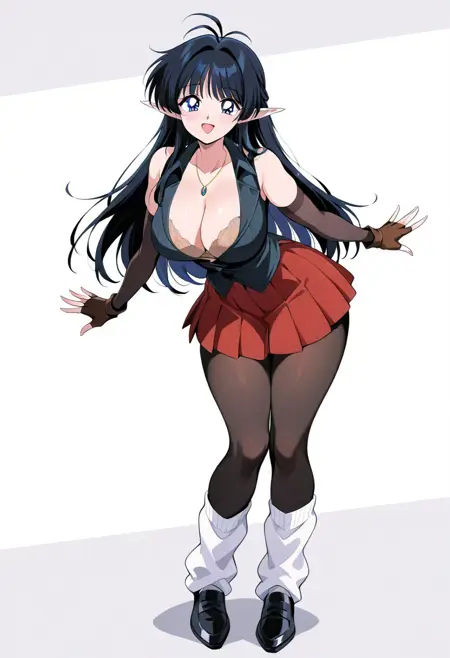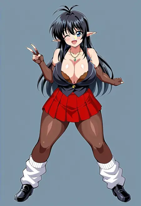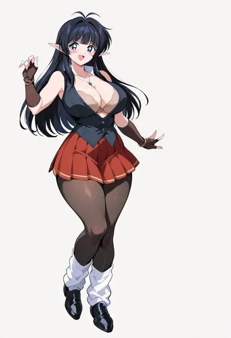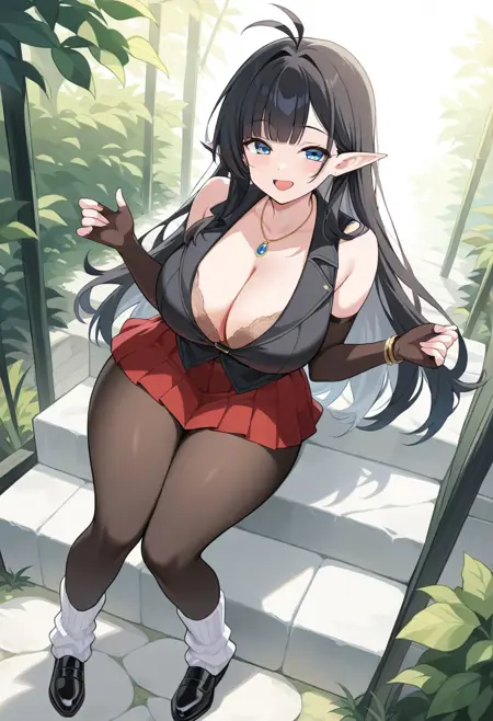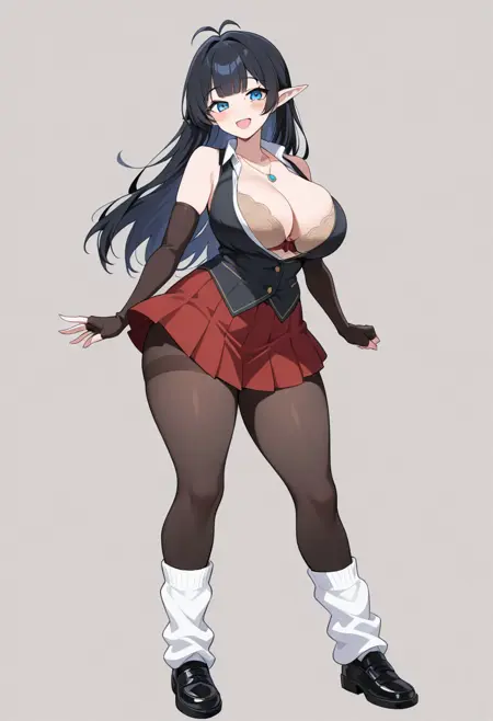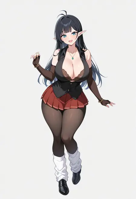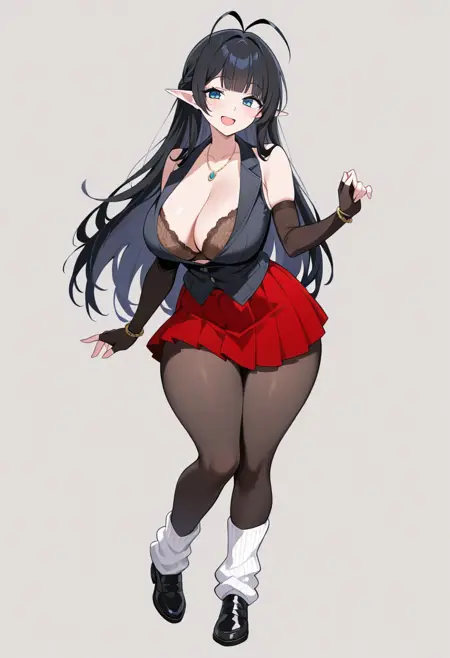 elf, breasts, blue eyes, black hair, gloves, black pantyhose, cleavage, skirt, long hair, front bangs, fingerless gloves, large breasts, antenna hair, dark brown gloves, red pleated skirt, thick thighs, jewelry, necklace, black elbow gloves, brown bra, black vest, bare shoulders, white loose socks, black shoes