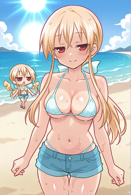 Outfit: sweet breaker, 1girl, blonde hair, chibi, long hair, red eyes, wings, smile, bow, blue jacket, pink buttons, white skirt, boots, sleeveless jacket, scarf