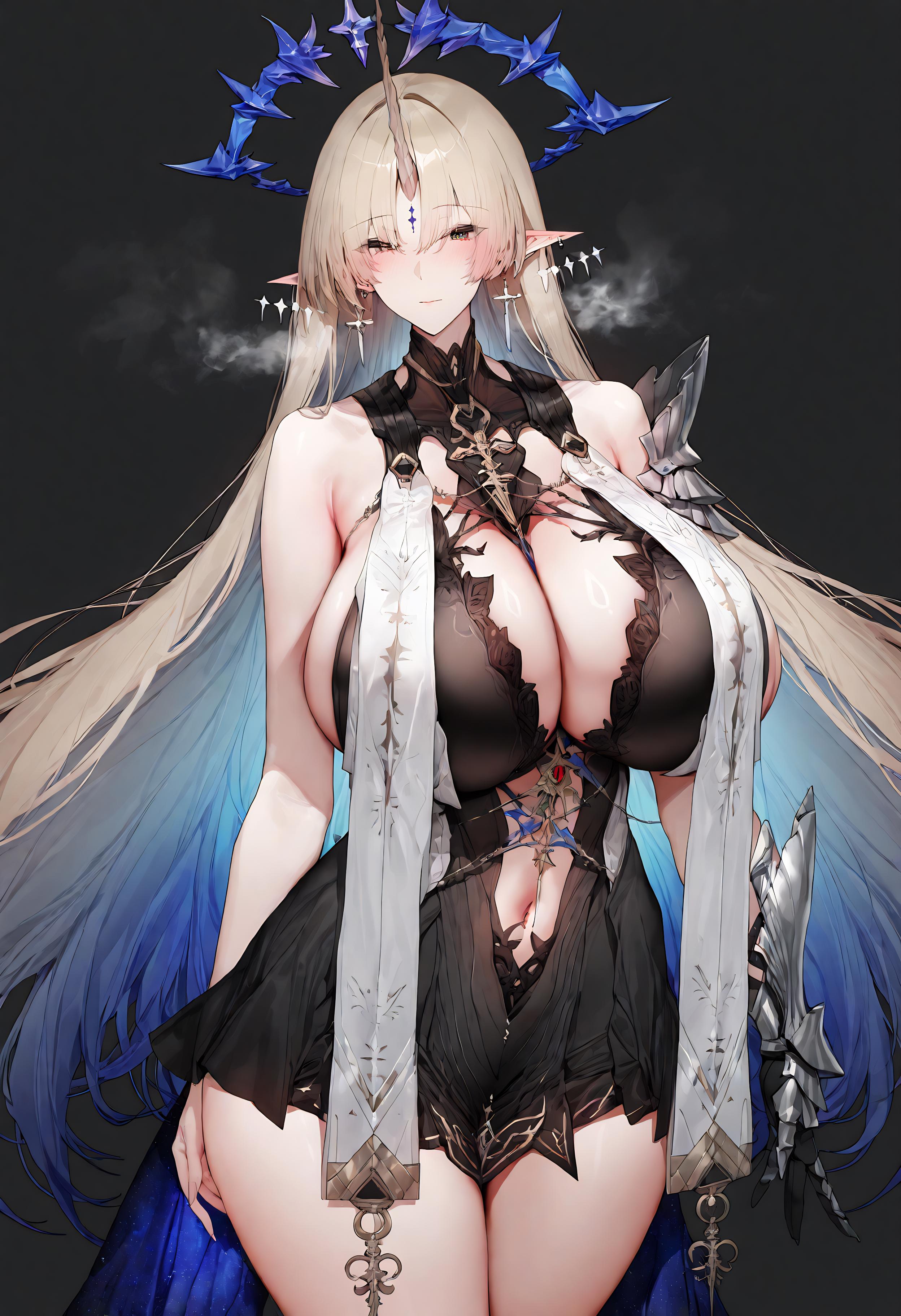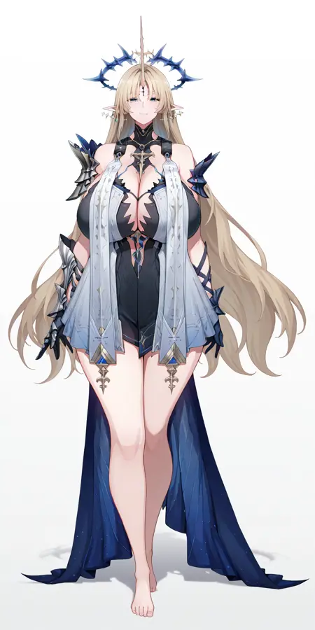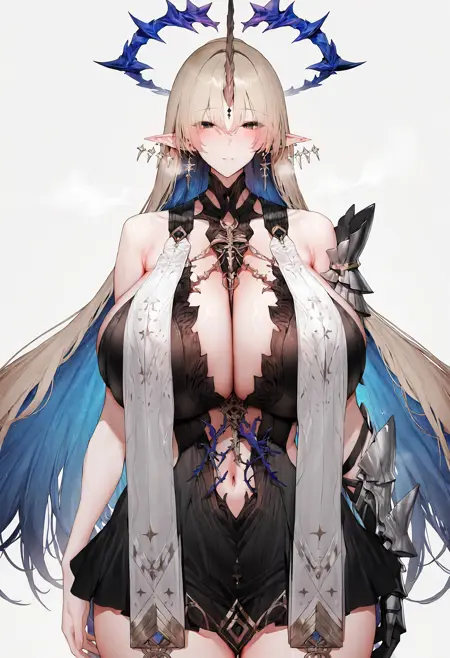 鸣潮-芙露德莉斯-fleurdelys,tacet mark,multiple earrings,blonde hair,spiked halo,single horn,stole,single pauldron,single vambrace,high-low dress,navel cutout,short dress.safetensors