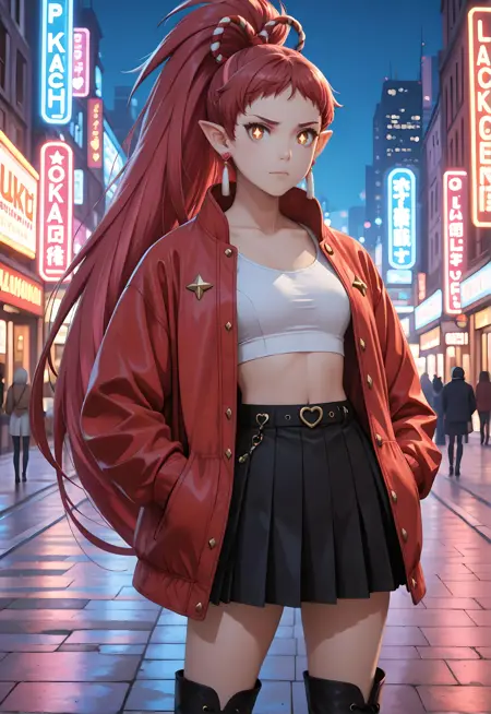 높은 포니테일, 나선형 빨간색 및 흰색 머리 끈, 빨간 킴ono 목선, 흰색 안쪽 킴ono, 노란 불 문양이 있는 킴ono 스타일의 빨간 코트, 갈색 띠, 가슴에 장식용 끈 매듭, 금색 끈 고정장치, 단순한 흰색 미니스커트, 전통 의상, 빨간 테두리가 있는 검정 부츠, 발가락이 드러나는 부츠, 발가락이 보임