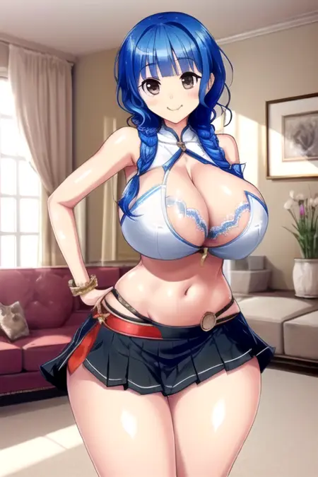 The tags are: blue hair, twin braids, short braids, blunt bangs, sidelocks, brown eyes,