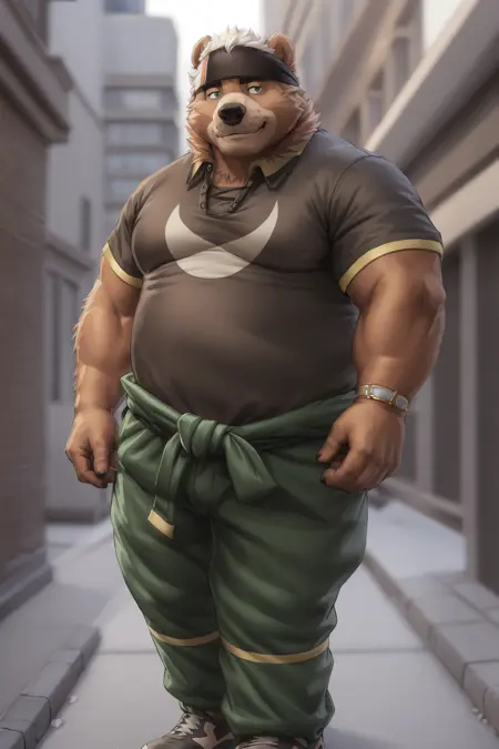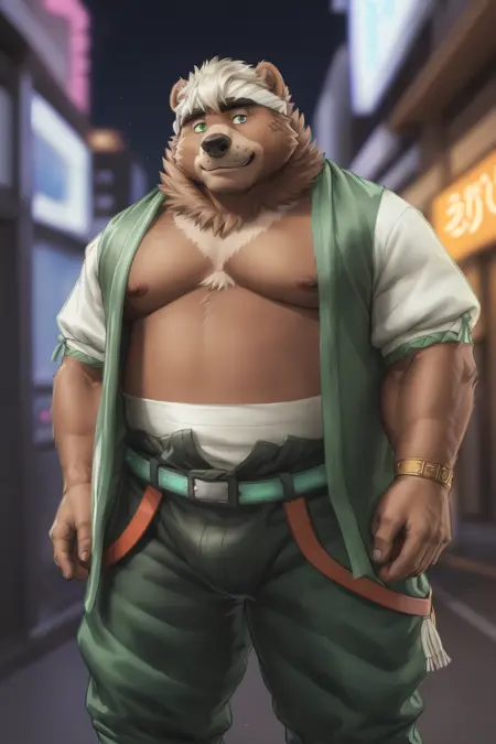 ヒーロー衣装: "日本の服、ベルト、パンツ、ヘアバンド、裸の胸元、緑のパンツ、ヒーロー衣装"