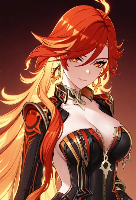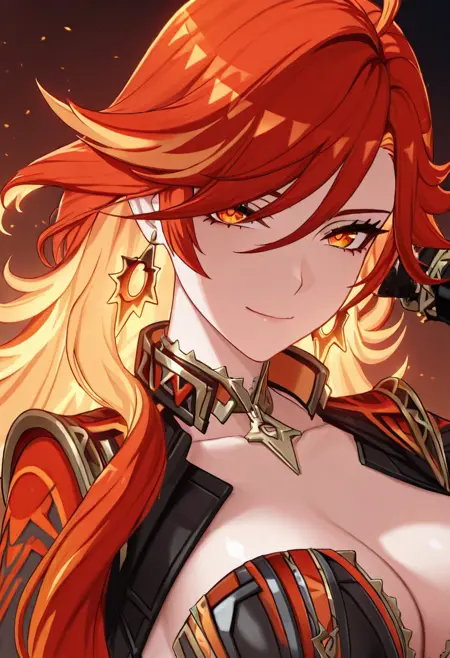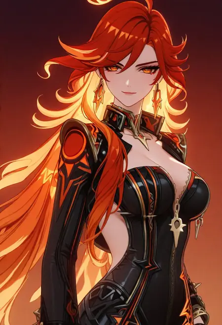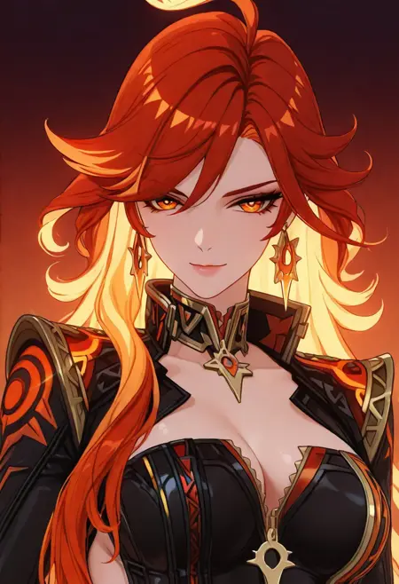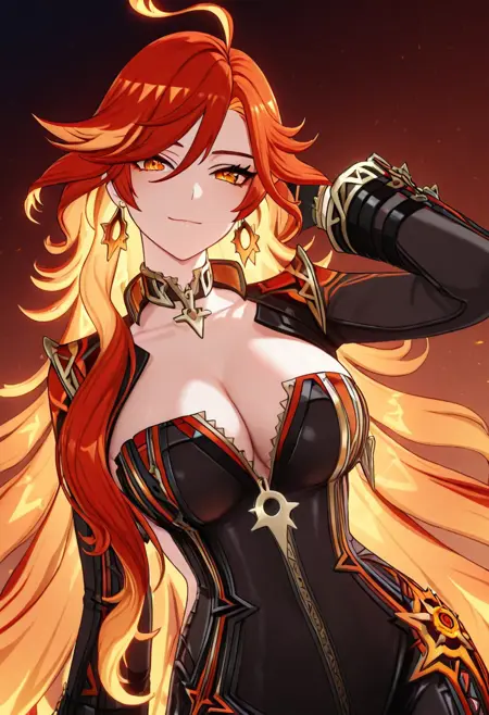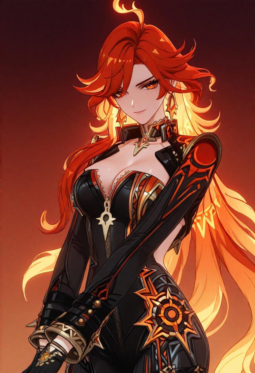 | 训练词汇 | Mavuika (Genshin Impact), long hair, orange hair, blonde hair, two tones hair, swept bangs, ahoge, bright orange eyes, sun symbol in eyes, gold earrings, bodysuit, black bodysuit, cleavage, chest window, open back bodysuit, red and gold details, gold accents, black and red color scheme, asymmetrical design, fire motif, gloves, spiked details, high heels,已复制! |