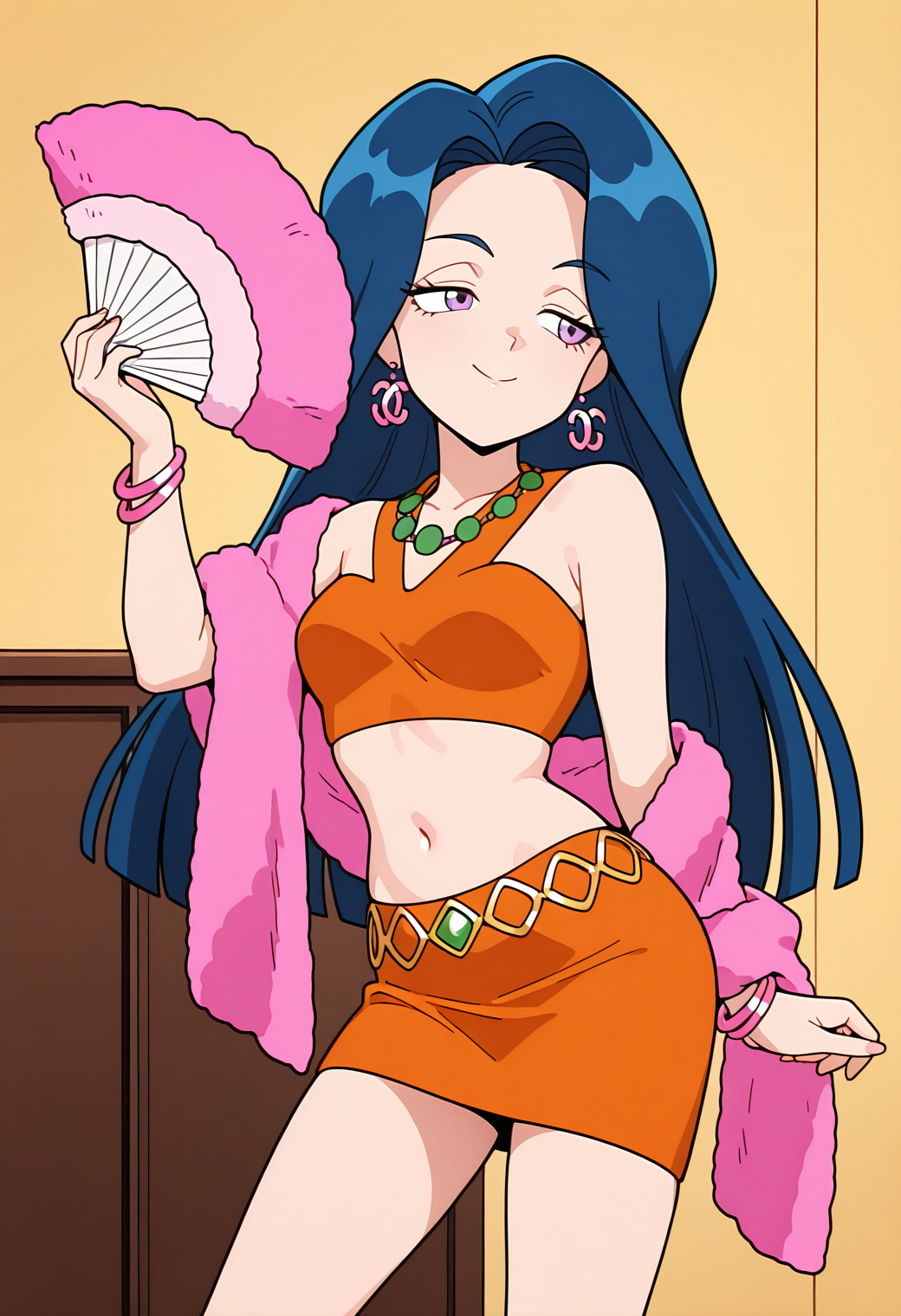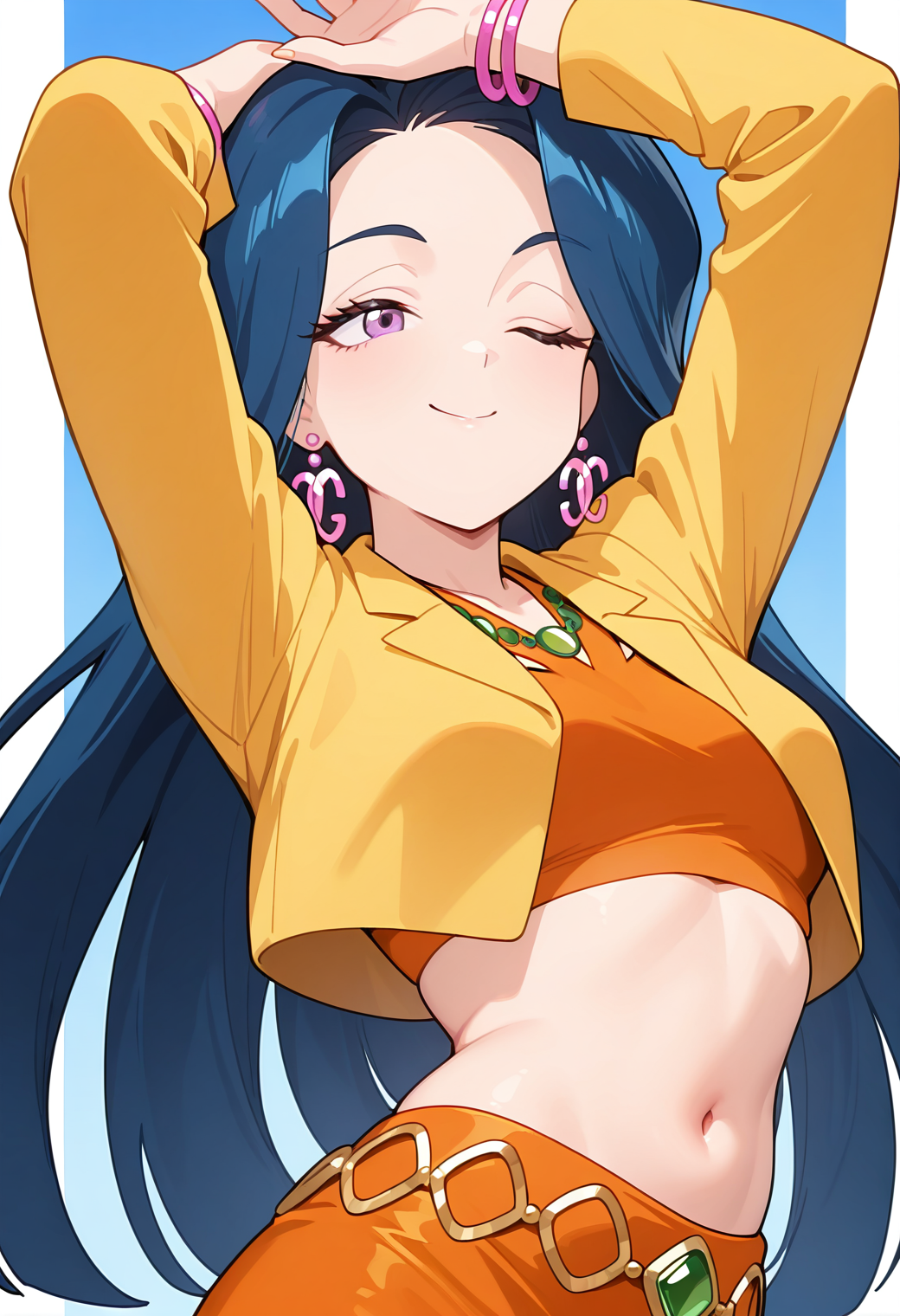 earrings, yellow jacket, cropped jacket, necklace, orange crop top, bracelet, midriff, navel, jewelry, orange skirt, pencil skirt, pink high heels