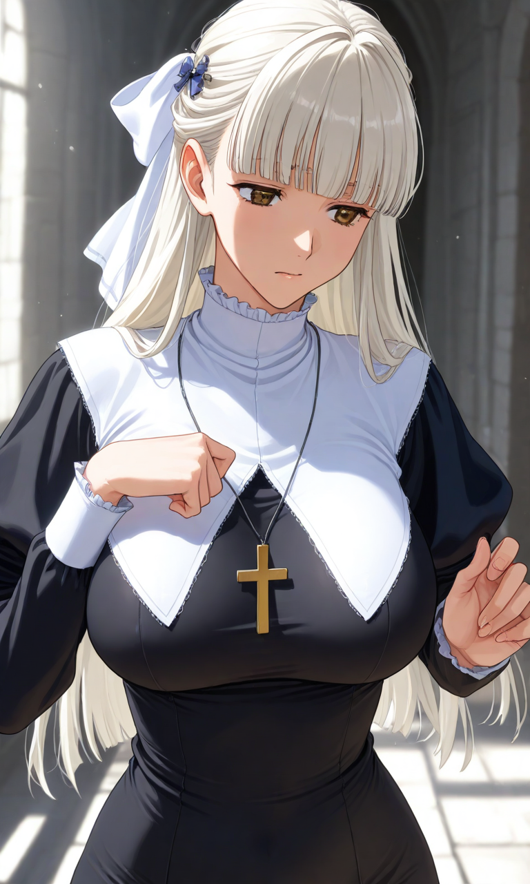 ssq wilma、プラチナヘア、ロングヘア、ハーフアップ、ベリーバング、白い髪リボン、髪飾り、クロスネックレス、大きな胸、修道女 アニメ再現を目指したけどこのザマ ブロンドヘア、青い目もお忘れなく、あと個人の使用範囲でお願いします。