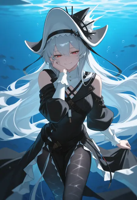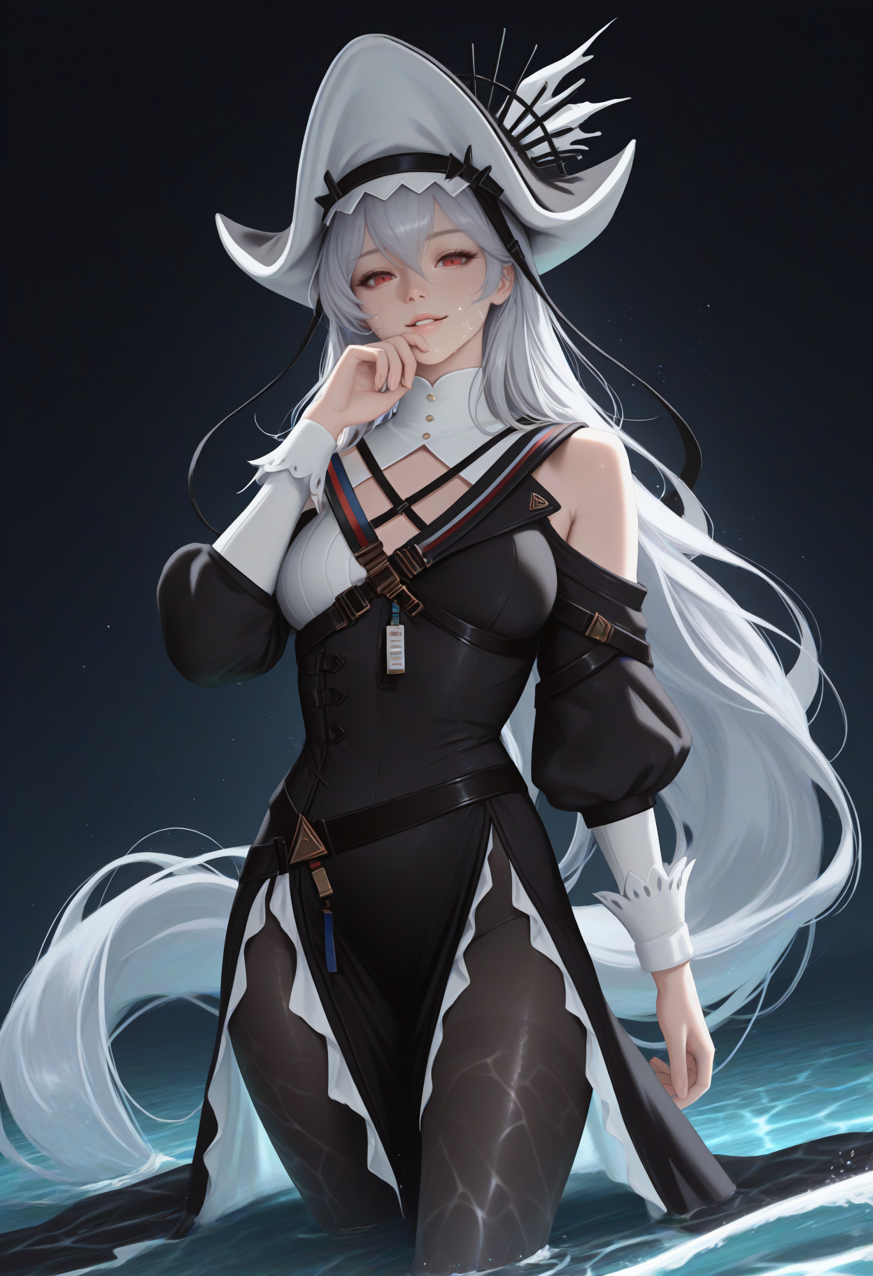 서브컬러: sp3cterudcr, 긴 머리, 회색 머리, 눈 사이의 머리카락, 검은 머리장식, 포크파이 모자, 붉은 눈, 긴 드레스, 계층적 드레스, 검은 드레스, 긴 소매, 흰 스카프, 여러 개의 목걸이, 십자 목걸이