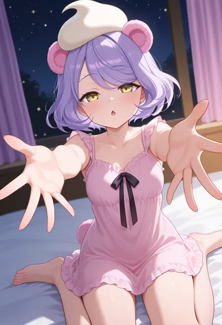 흰 모자, 보라색 머리, 단발, 노란 눈, 분홍색 동물 귀, 곰 귀, 분홍색 꼬리,