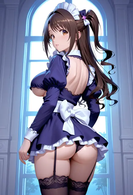 <lora:idress_b03:0.7> black thighhighs,clothing cutout, frills, garter straps, idress_b03, lace trim,underboob, underwear, maid,